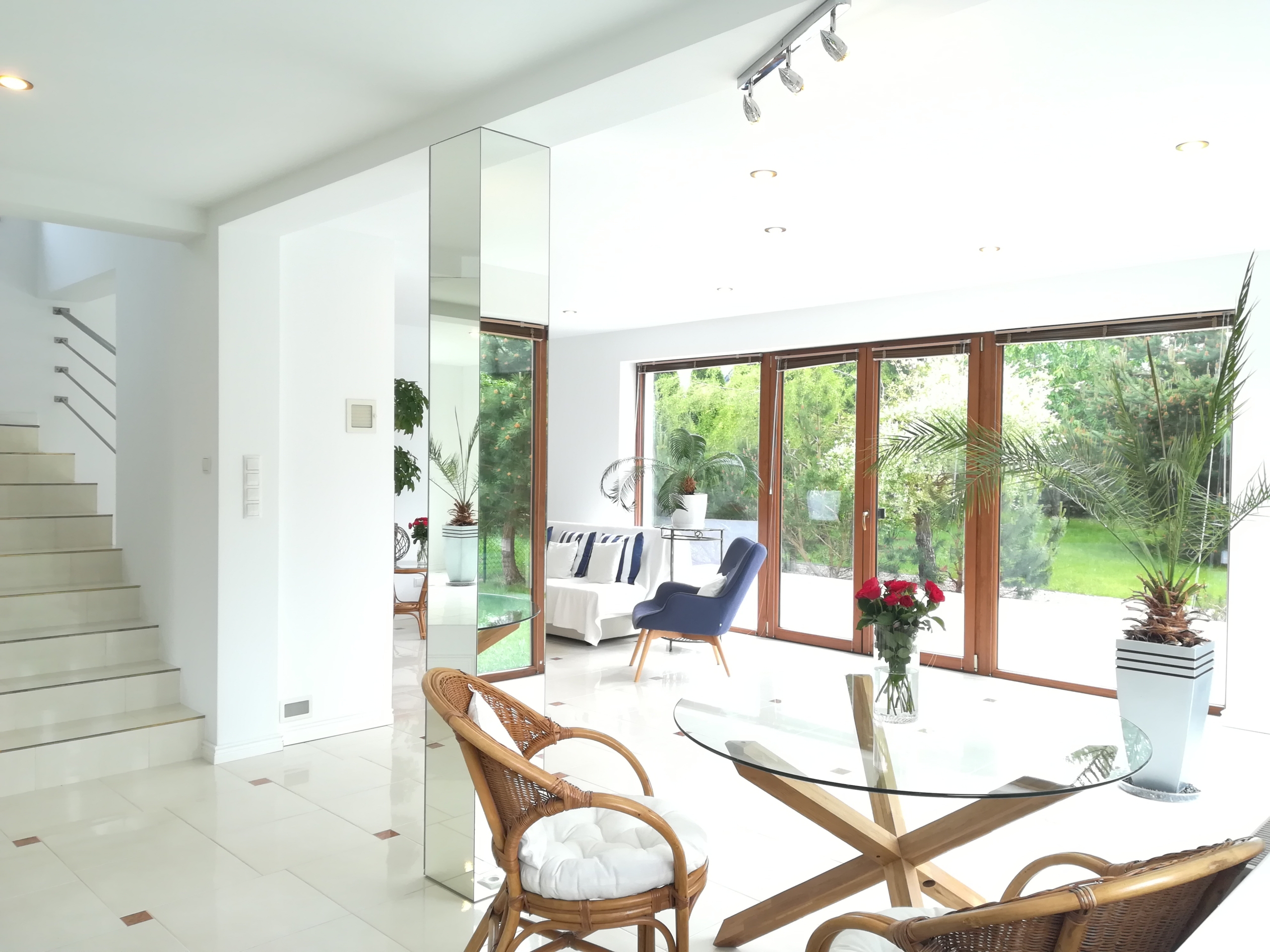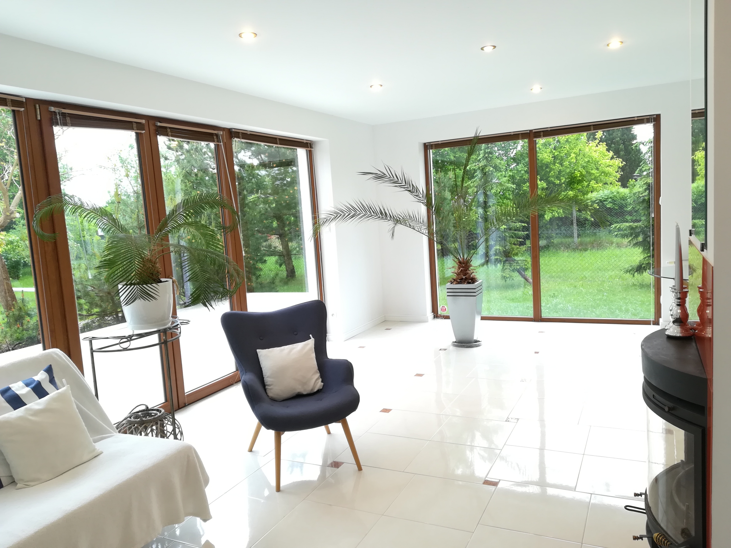 Wjazd na posesję od strony północnej przez bramę sterowaną pilotem. Ogród od strony południowej. Salon i jadalnia usytuowane od strony południowo-zachodniej z wyjściem na taras. Łazienki od strony zachodniej.